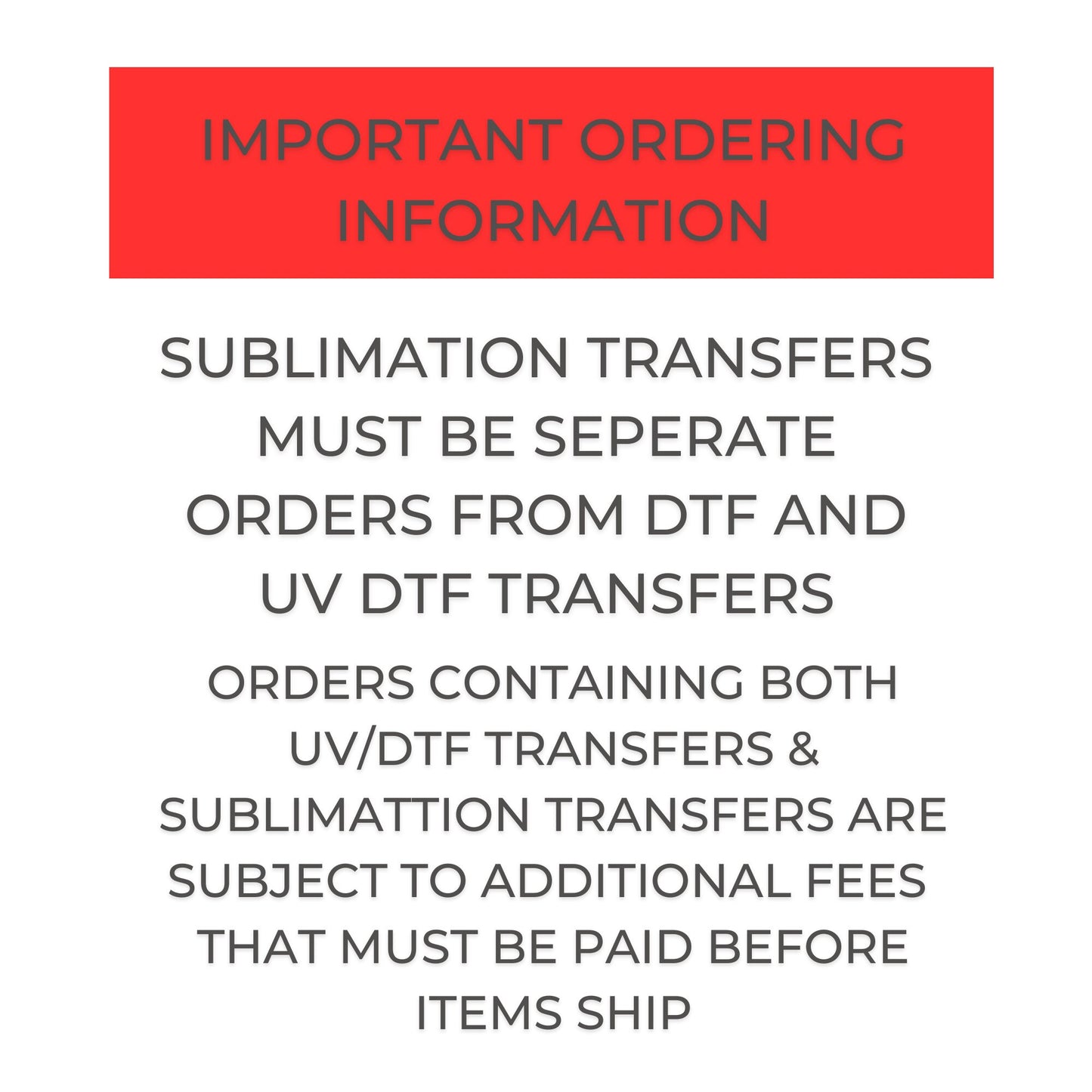 SUBLIMATION TRANSFERS MUST BE SEPARATE ORDERS FROM DTF AND UV DTF TRANSFERS