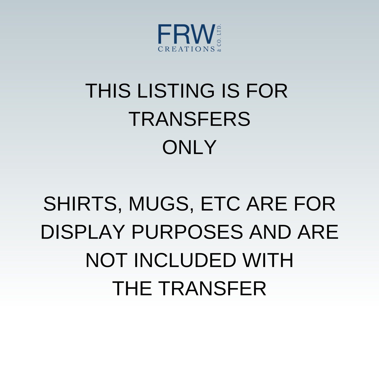 This is a TRANSFER ONLY. Items like t-shirts, mugs etc are for illustration purposes.